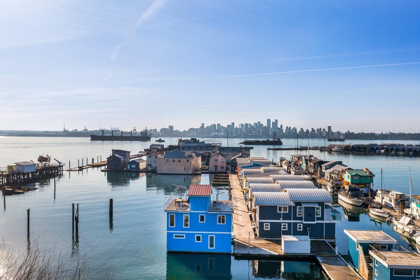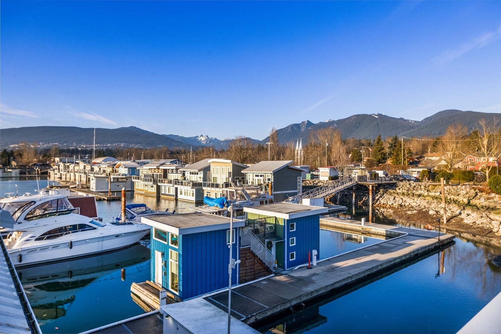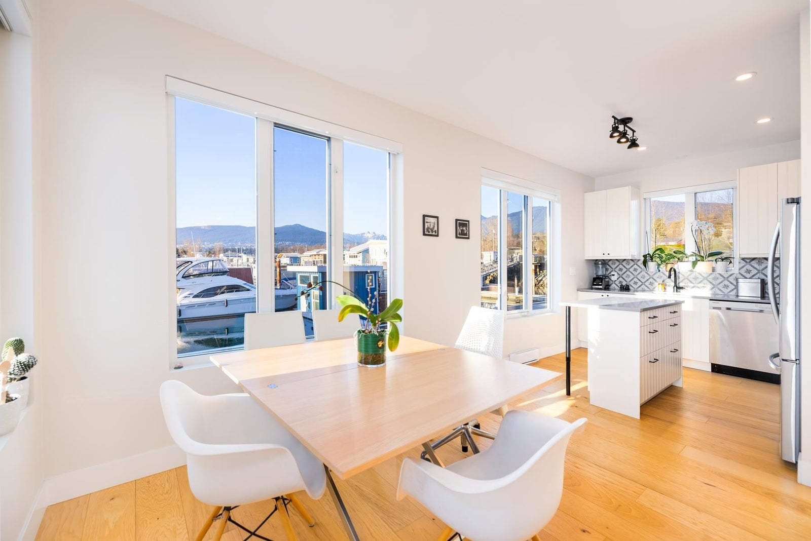 Experience the ultimate waterfront lifestyle at Mosquito Creek Marina in this newer built floathome designed for relaxed West Coast living. The highlight is a spectacular 528 sq ft rooftop deck with panoramic views, complete with water, power, and gas for effortless entertaining or relaxing year-round. Smart reverse-plan layout maximizes light and views. Entry level offers a spacious foyer, two bedrooms, elegant 5-piece bath with separate soaker tub and shower, plus laundry and storage. Upstairs features open-concept kitchen and dining, pantry, powder room, and bright living room with gas fireplace opening to a sunny south-facing deck. Bonus 192 sq ft flex room ideal for office, guests, or studio. Pets and rentals, including AirBnB, allowed in this family-friendly community.