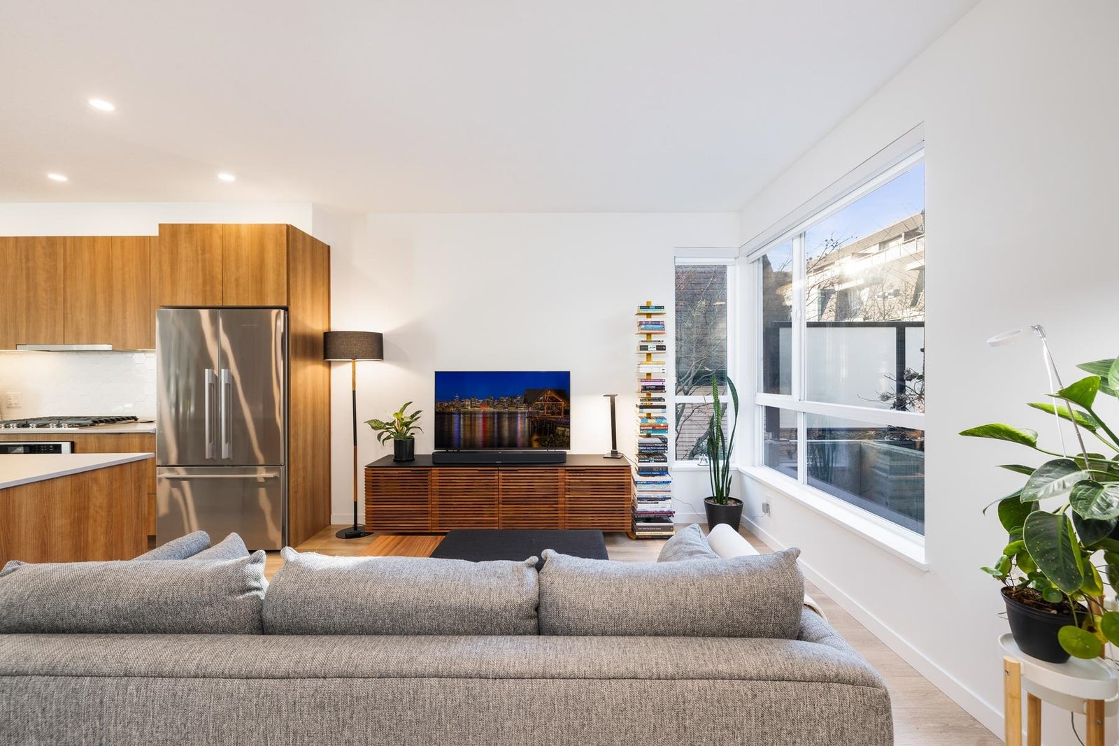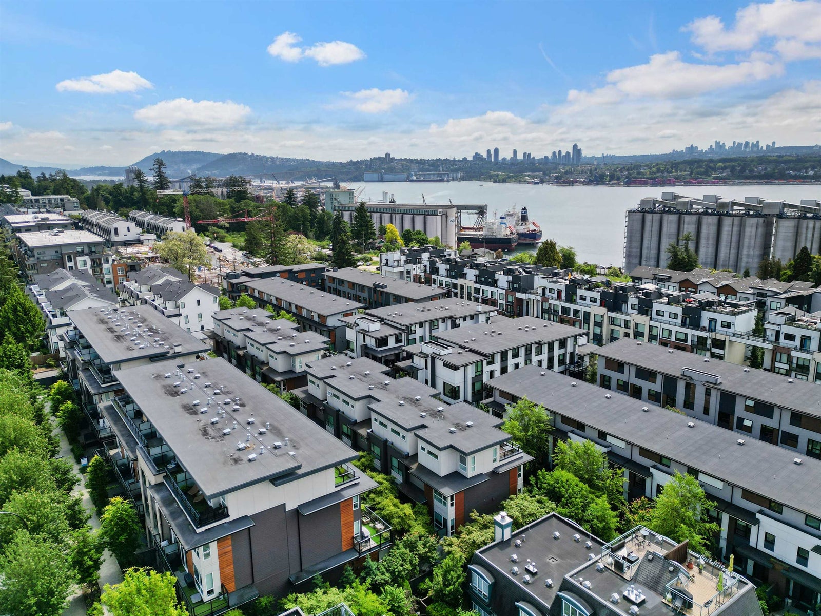 Welcome to Founders Block, a LEED Gold community by reputable developer Anthem Properties in the highly desirable Moodyville neighbourhood of North Vancouver. Arguably the nicest townhome in the complex, this exceptional south-west facing corner residence is flooded with natural light and positioned on the quiet side, offering panoramic city, water, and mountain views. This mint-condition 4-bedroom, 3-bath home features an open-concept layout with high ceilings, a stone island kitchen with gas range, radiant in-floor heating, office nook, upper laundry, oversized storage, a spa-like primary suite with walk-in closet and view deck, two secure parking stalls, and steps to Lower Lonsdale, the SeaBus, Moodyville Park, and The Shipyards.